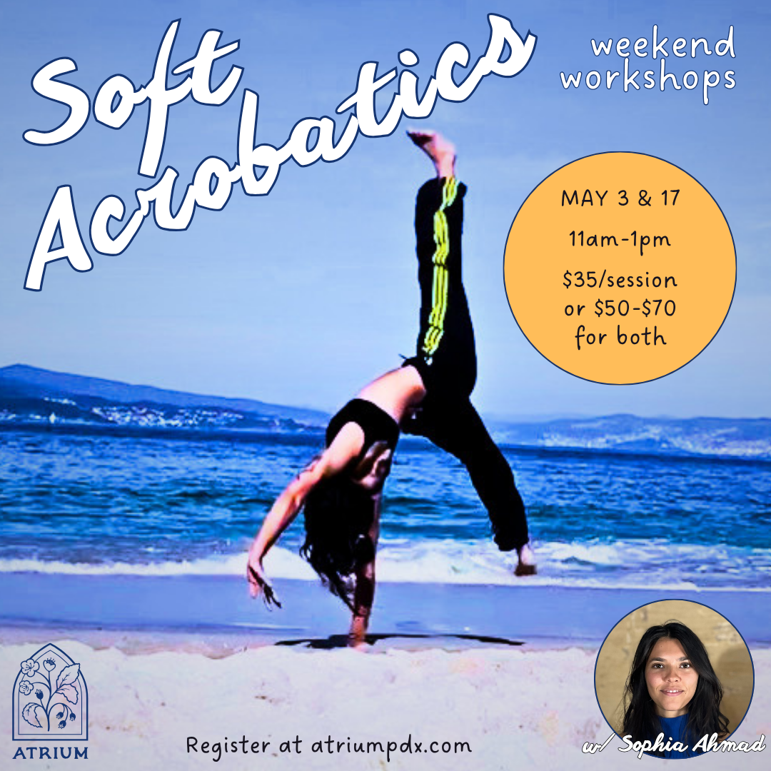 Soft Acrobatics is a dance class in which we integrate concepts and dynamics inspired by Capoeira, Contemporary Dance & Contact Improvisation. To register for both May workshops and receive the discount please email us at connect@atriumpdx.com